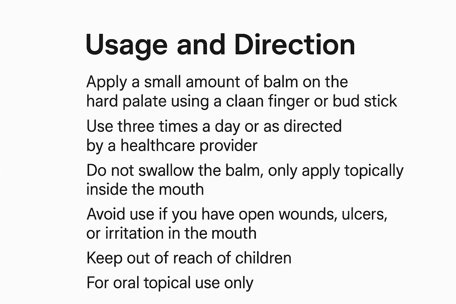 Apply a small amount on the hard palate with a clean finger or bud stick.